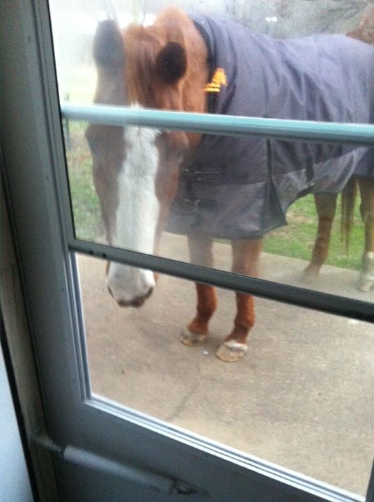 Mainstay and a couple of other geriatric horses occasionally get the run of the property, but they still like to hangout with their humans. Here, Mainstay is trying to come into the house.